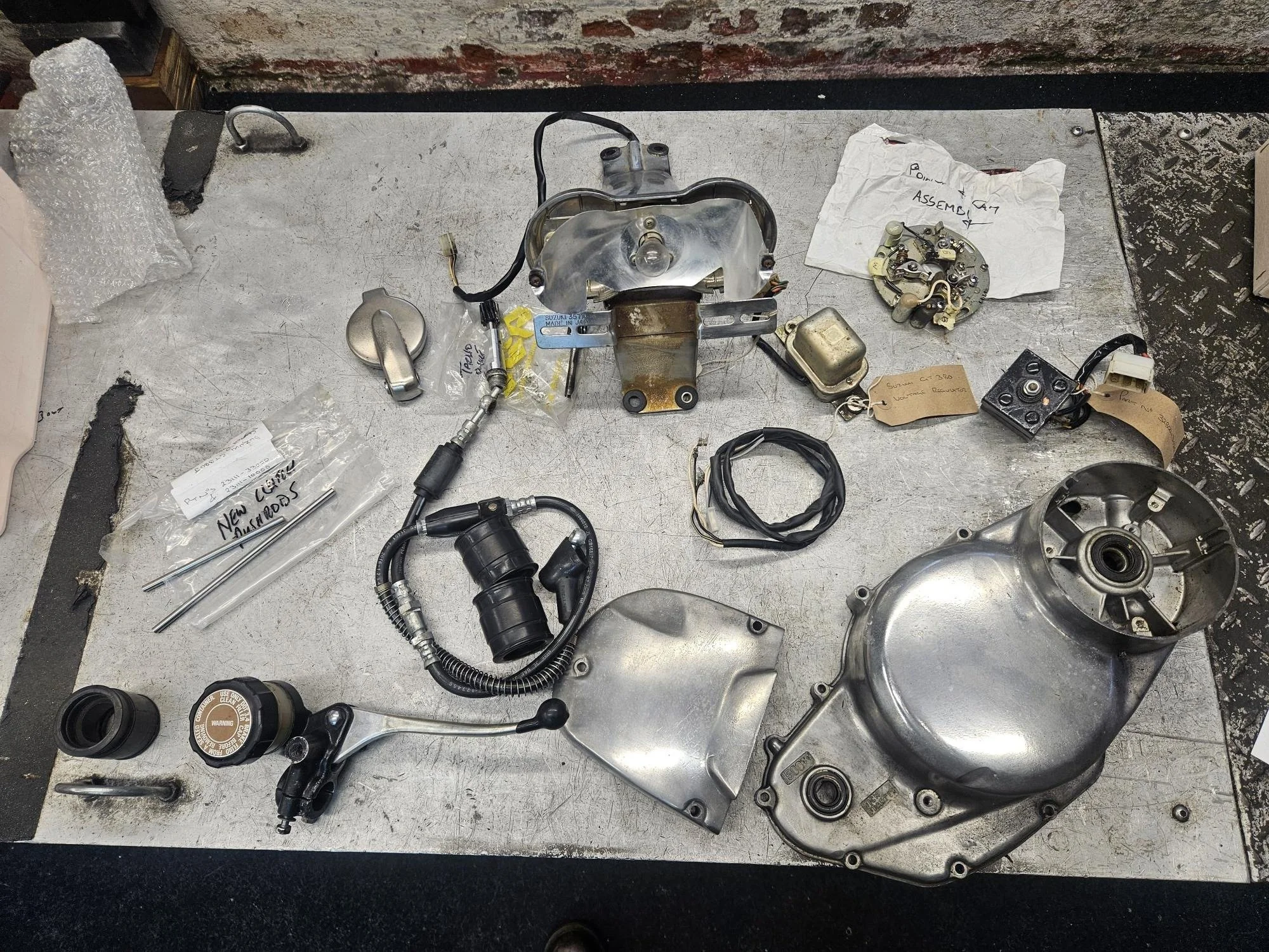 Assorted parts for the GT380, these parts came off a working J model , the carb top boots and clutch pushrods are new, the rest of the parts are used, the front master cylinder has good pressure, the electrics were only replaced to upgrade the system. All the parts you see are included. Collection from Bridlington,